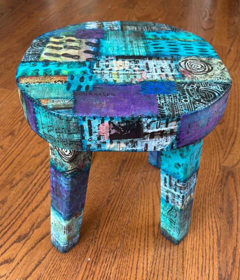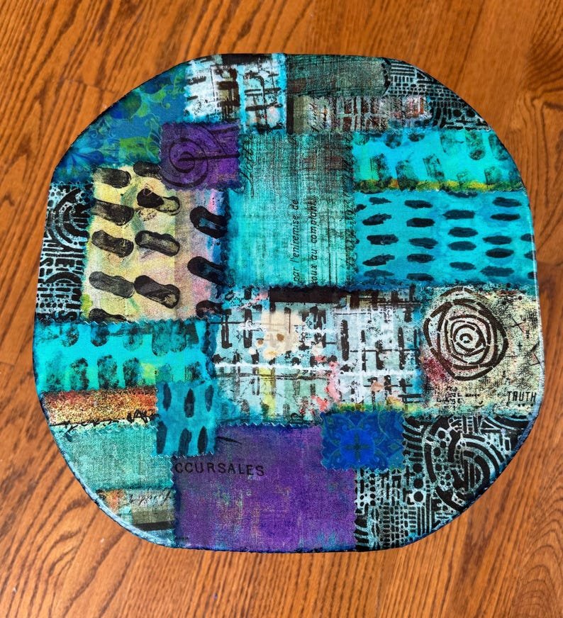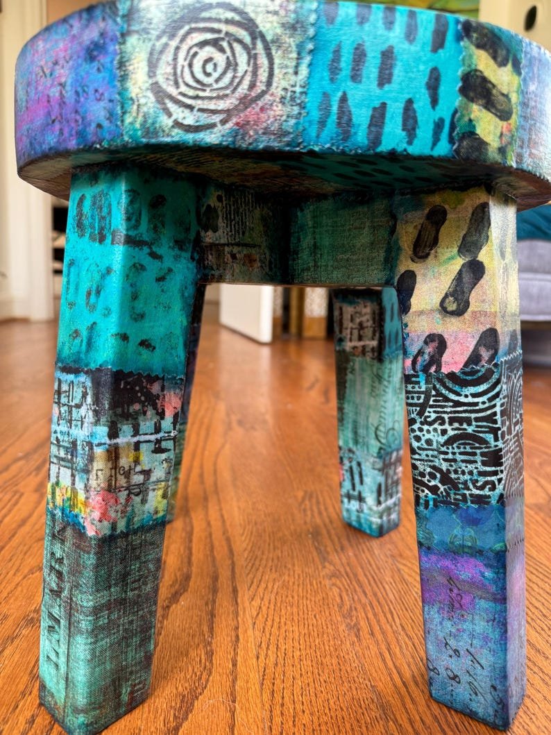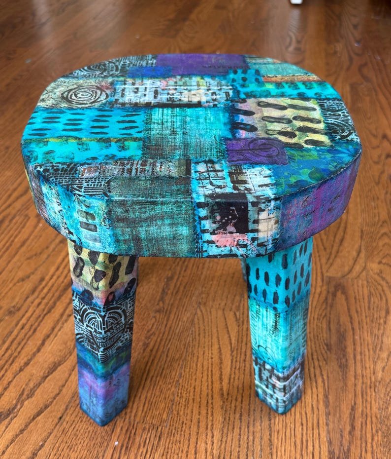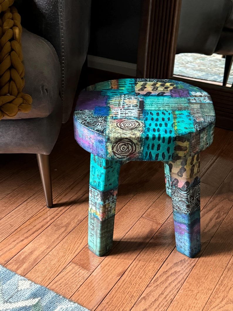 Colorful Boho Ecelectic Stool 12 x 12 | Live Edge Patchwork Collage Stool for Home or Office