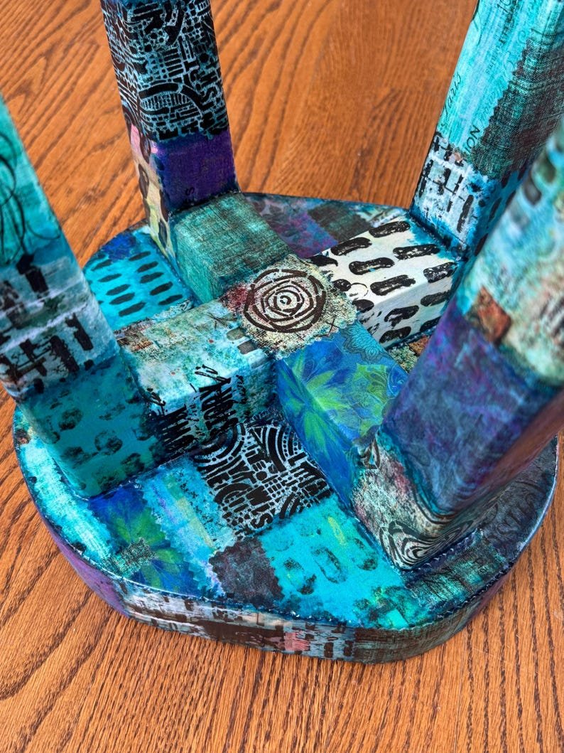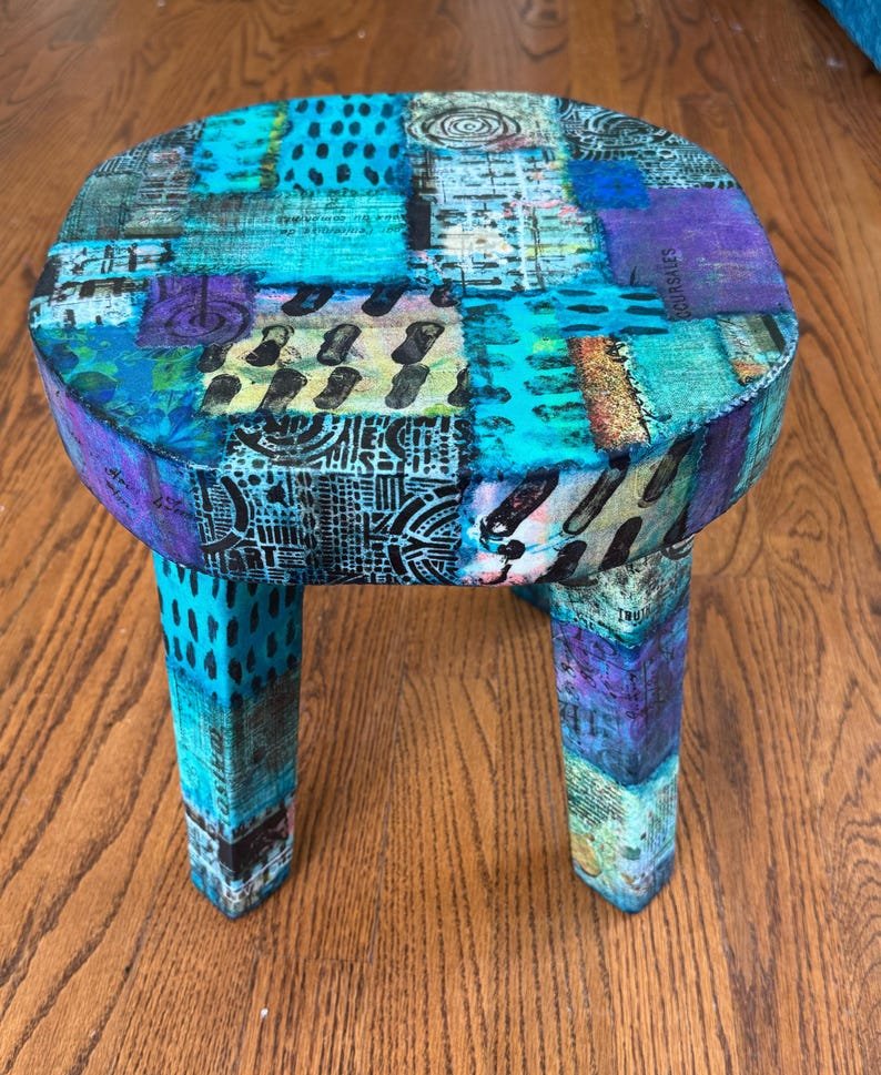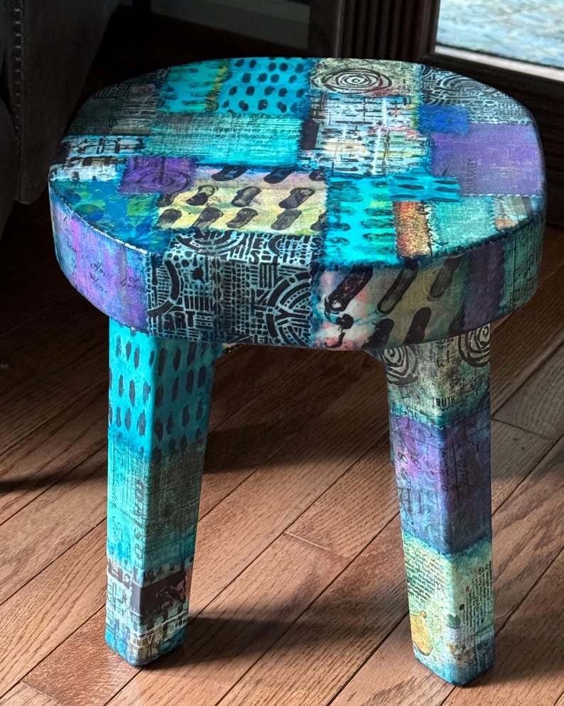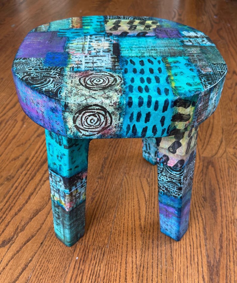 Colorful Boho Ecelectic Stool 12 x 12 | Live Edge Patchwork Collage Stool for Home or Office