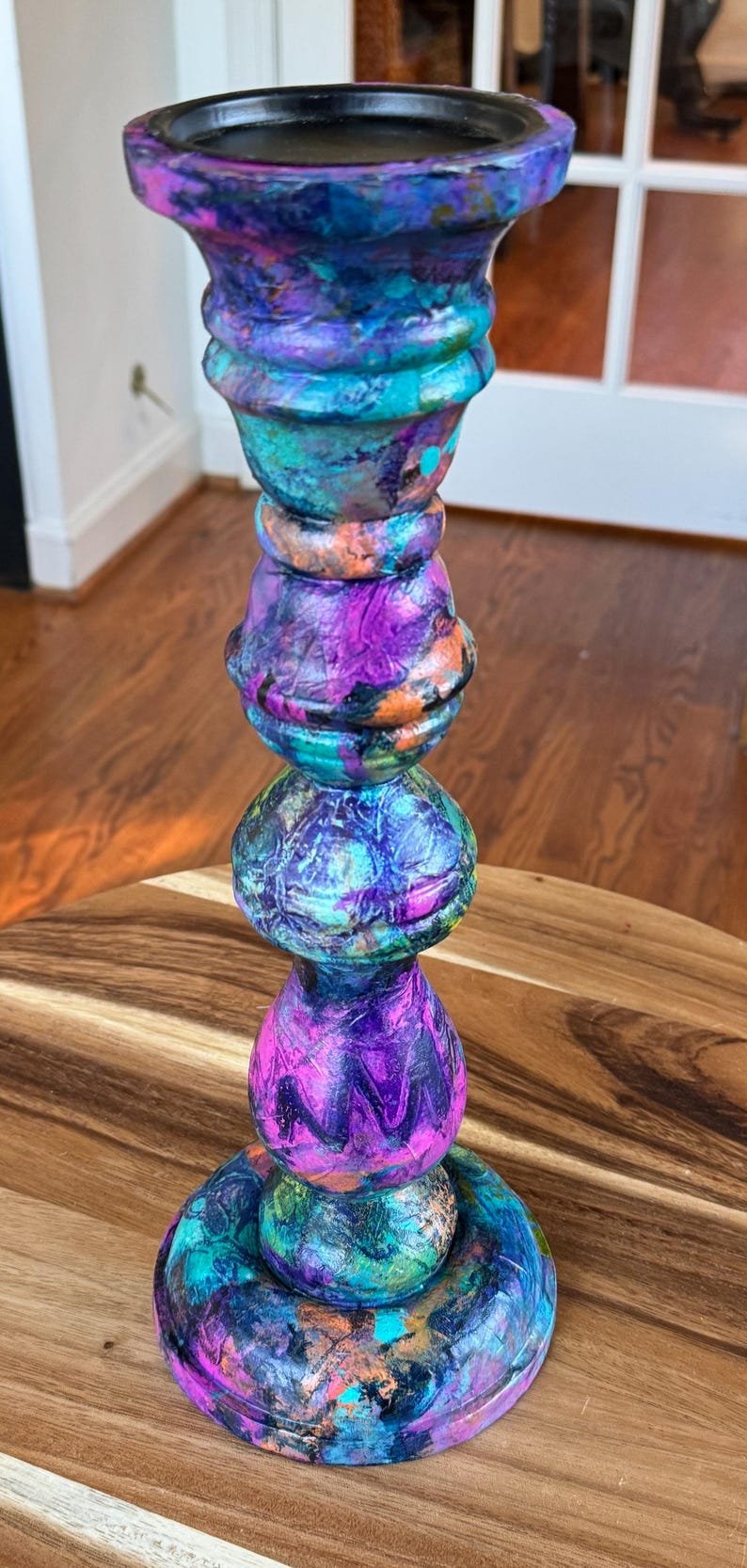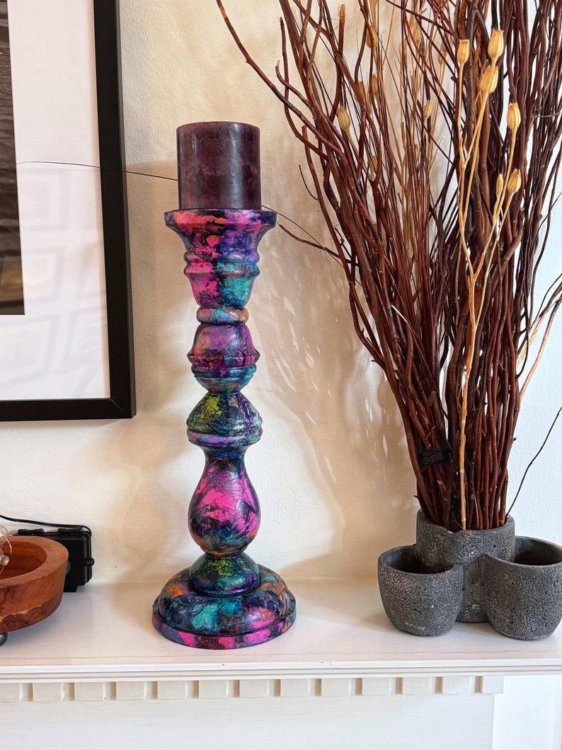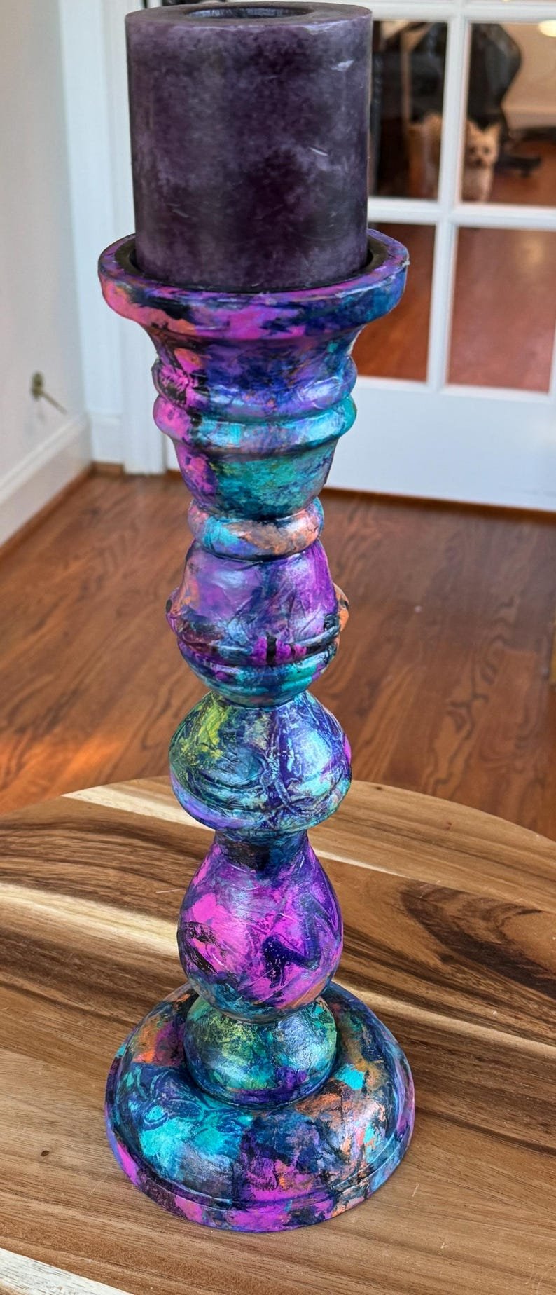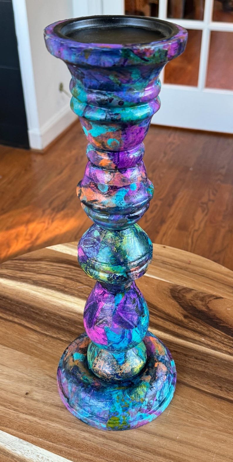 Eclectic pillar candlestick holder upcycled with hand painted mulberry paper that is deconstructed and decoupaged into an eclectic patchwork of vibrant colors and patterns. The delicate rice paper is hand painted in a modern abstract paint style with acrylic paint and alcohol ink and sealed with a non-toxic satin varnish for durability and longevity of saturated color and texture.