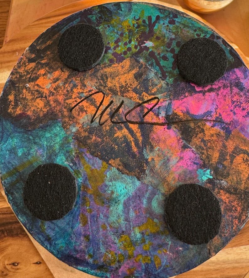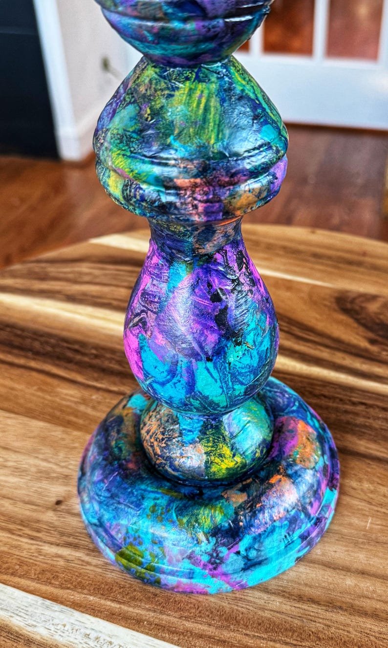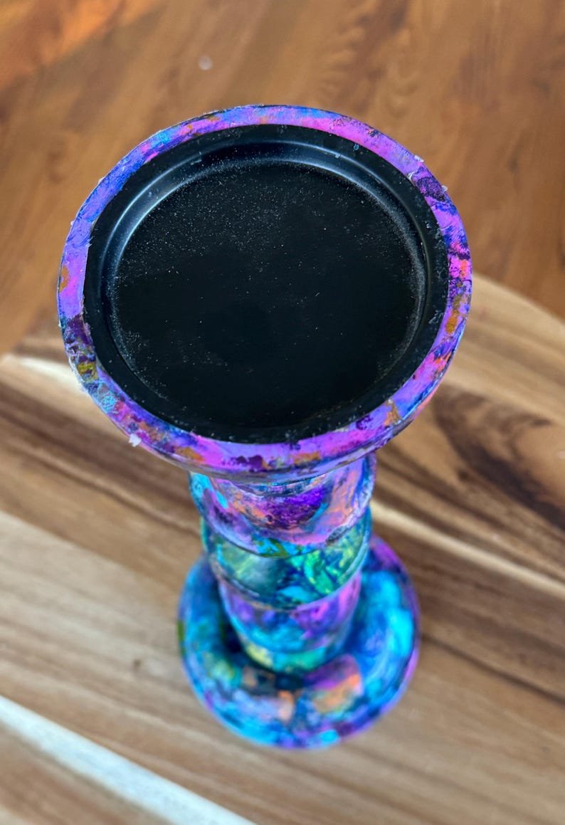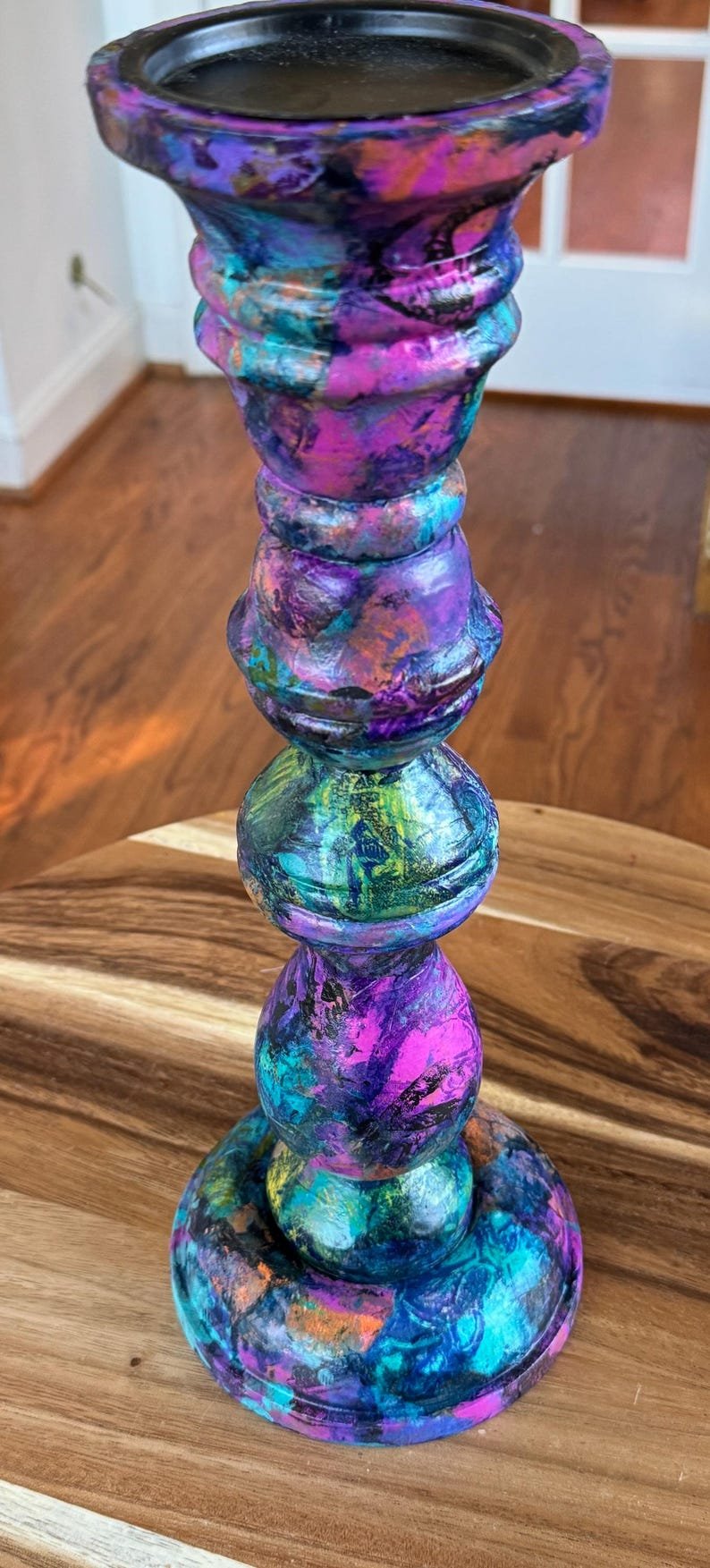 Eclectic pillar candlestick holder upcycled with hand painted mulberry paper that is deconstructed and decoupaged into an eclectic patchwork of vibrant colors and patterns. The delicate rice paper is hand painted in a modern abstract paint style with acrylic paint and alcohol ink and sealed with a non-toxic satin varnish for durability and longevity of saturated color and texture.