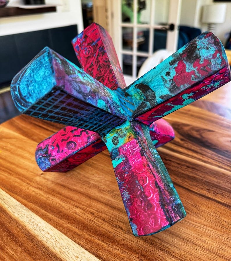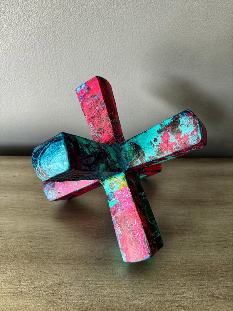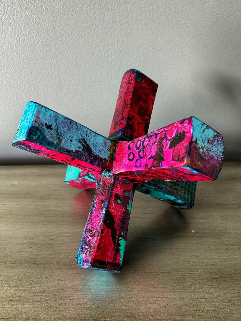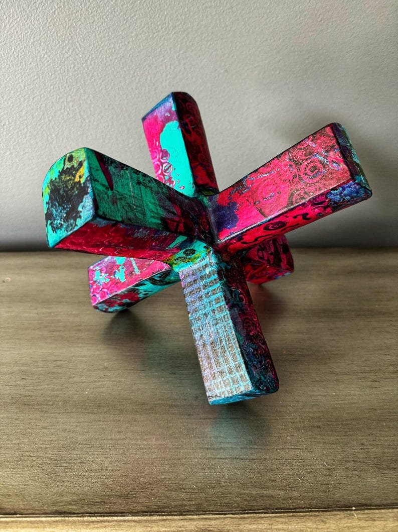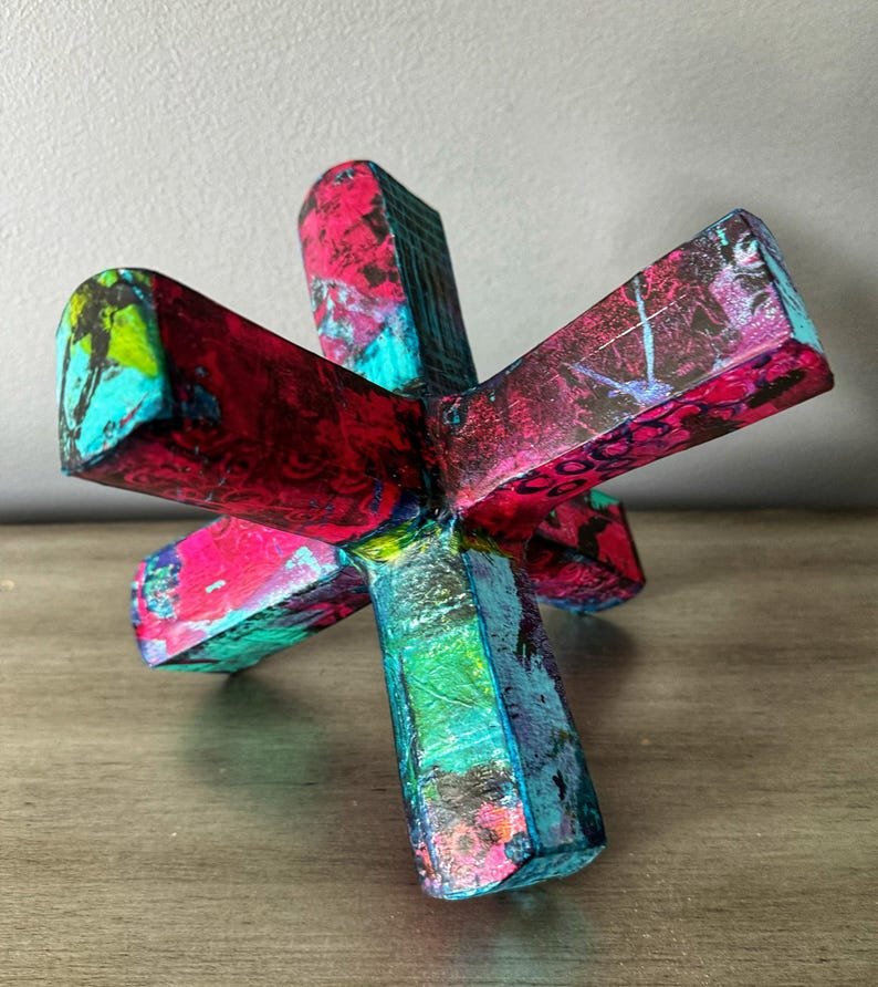 Modern abstract jack sculpture upcycled with hand painted mulberry paper that is deconstructed and decoupaged into an eclectic patchwork of vibrant colors and patterns. The delicate rice paper is hand painted with acrylic paint and alcohol ink and sealed with a non-toxic matte varnish for durability and longevity of saturated color and texture.