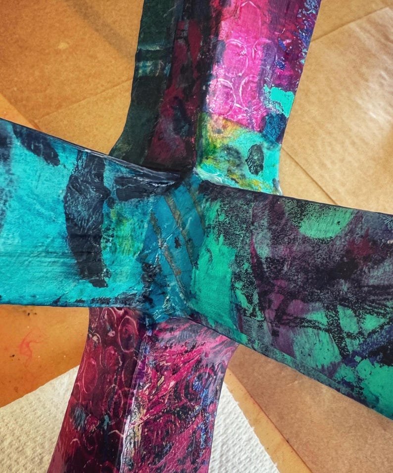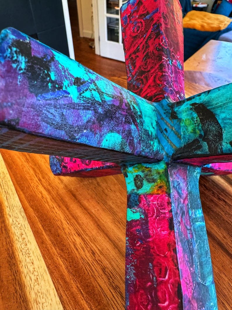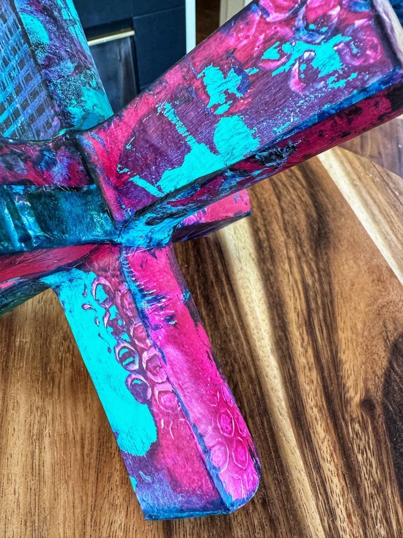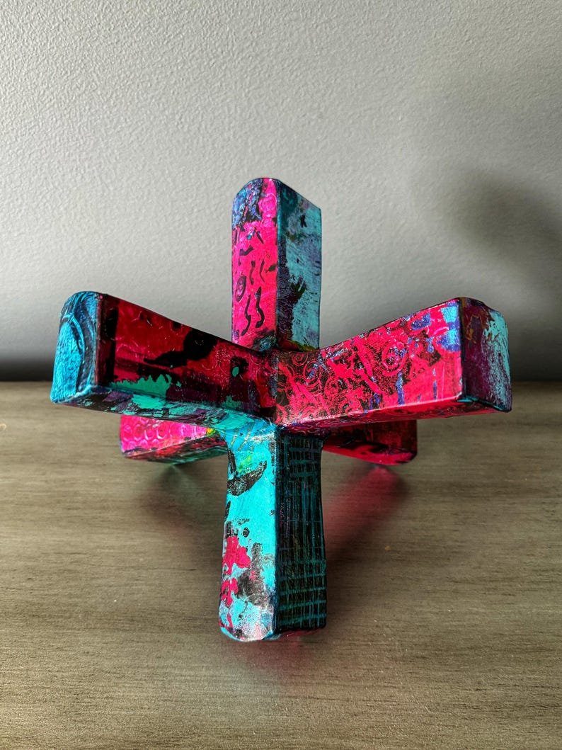 Modern abstract jack sculpture upcycled with hand painted mulberry paper that is deconstructed and decoupaged into an eclectic patchwork of vibrant colors and patterns. The delicate rice paper is hand painted with acrylic paint and alcohol ink and sealed with a non-toxic matte varnish for durability and longevity of saturated color and texture.