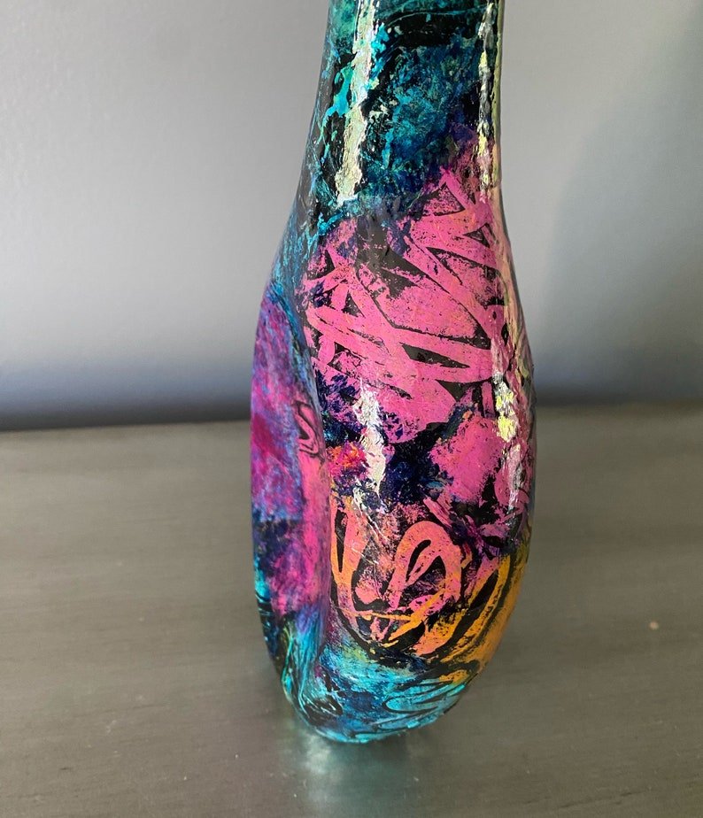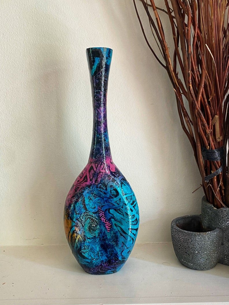 Colorful abstract long-neck metal vase upcycled with hand painted mulberry paper that is deconstructed and decoupaged into an eclectic patchwork of vibrant colors and patterns. The delicate rice paper is hand painted with acrylic paint and alcohol ink and sealed with a non-toxic gloss varnish for durability and longevity of saturated color and texture.