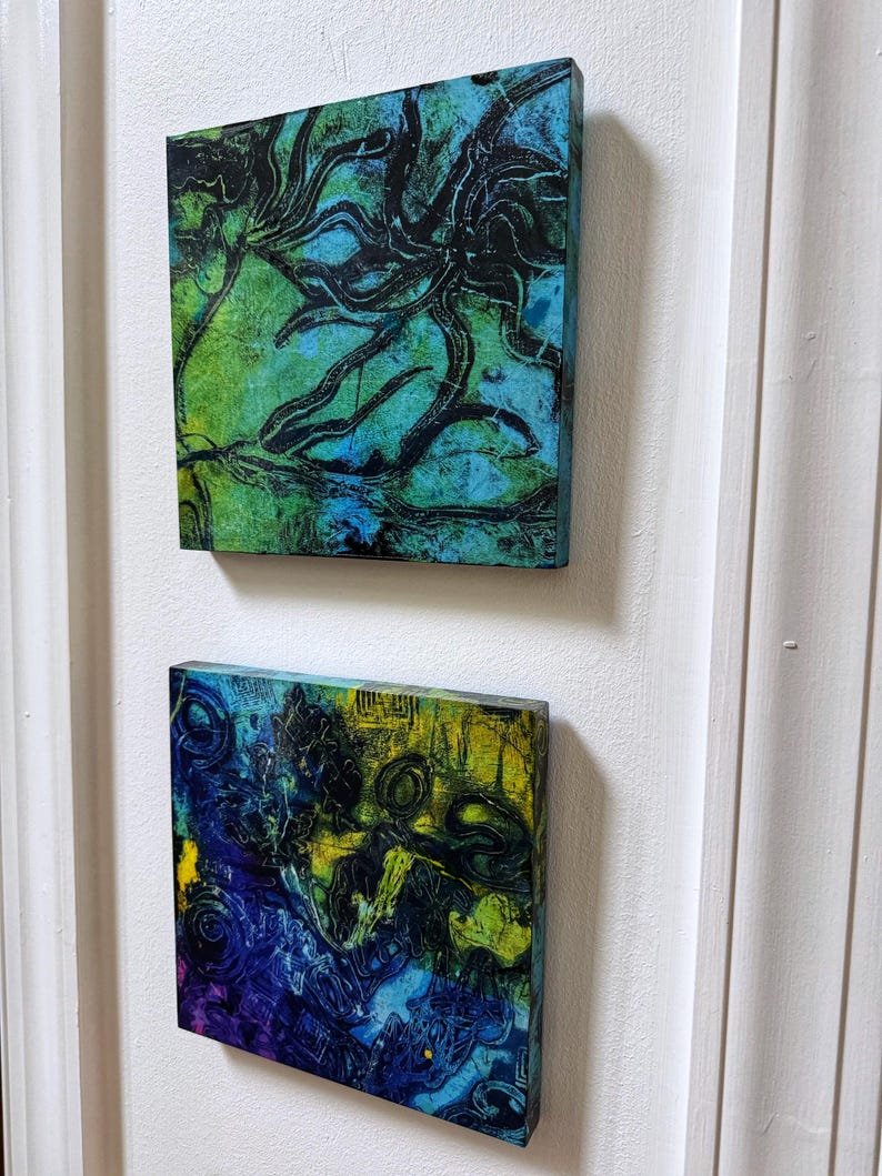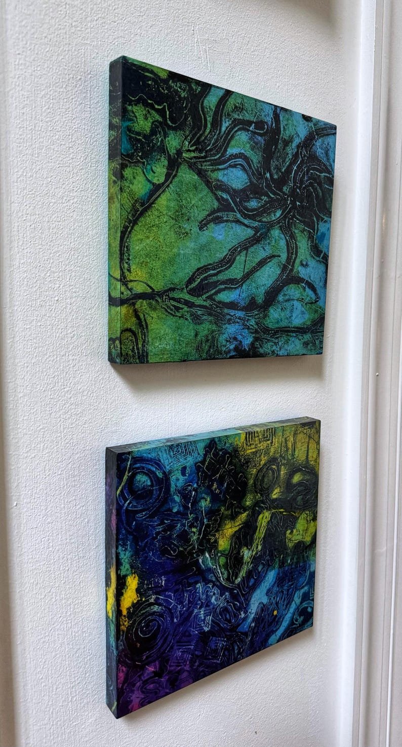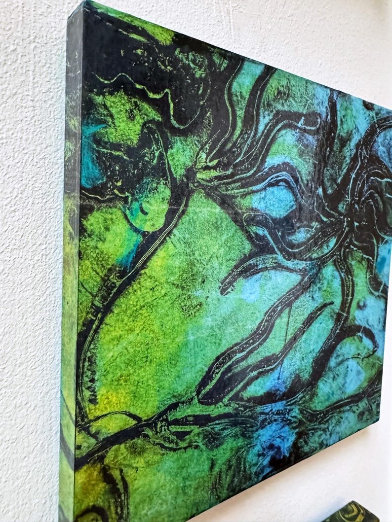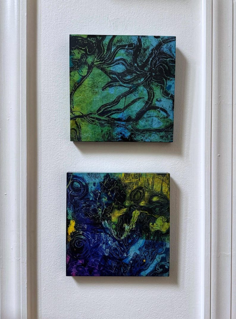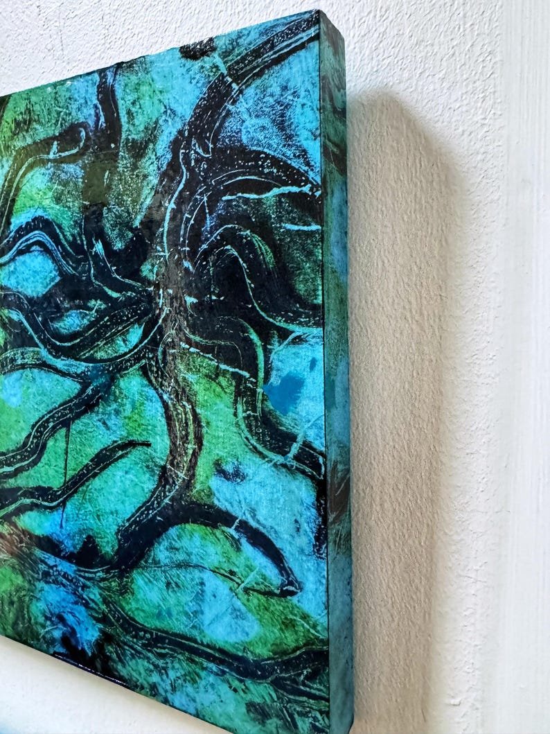 Colorful, abstract, and ready to hang wall art made from a limited printing of an original hand painted work that is decoupaged onto a wooden canvas with sumi rice paper and sealed with a glossy sheen non-toxic varnish for durability and longevity of saturated color and texture.