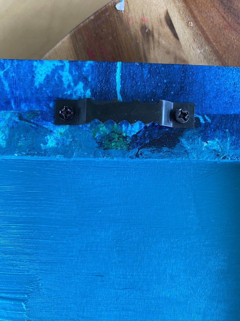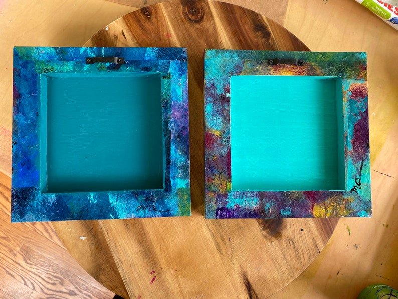 Colorful abstract ready to hang wall art made with hand painted mulberry paper that is decoupaged onto a wooden canvas. The delicate rice paper is hand painted with acrylic paint and alcohol ink and then sealed with a glossy sheen non-toxic varnish for durability and longevity of saturated color and texture.