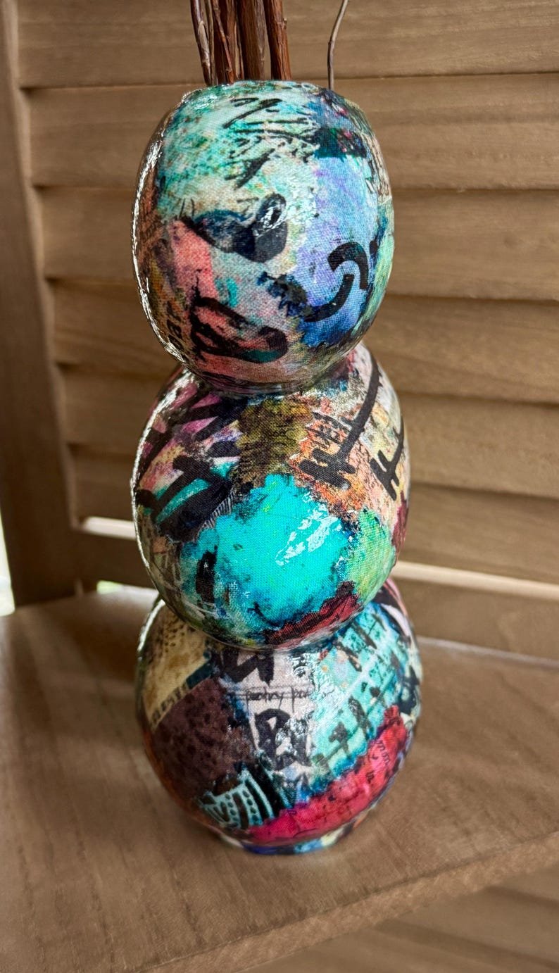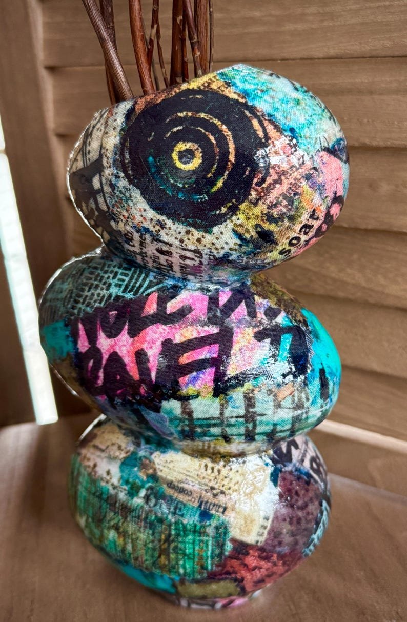 Colorful boho grunge vase upcycled with premium fabrics that are deconstructed and decoupaged into an eclectic patchwork of vibrant colors and patterns.