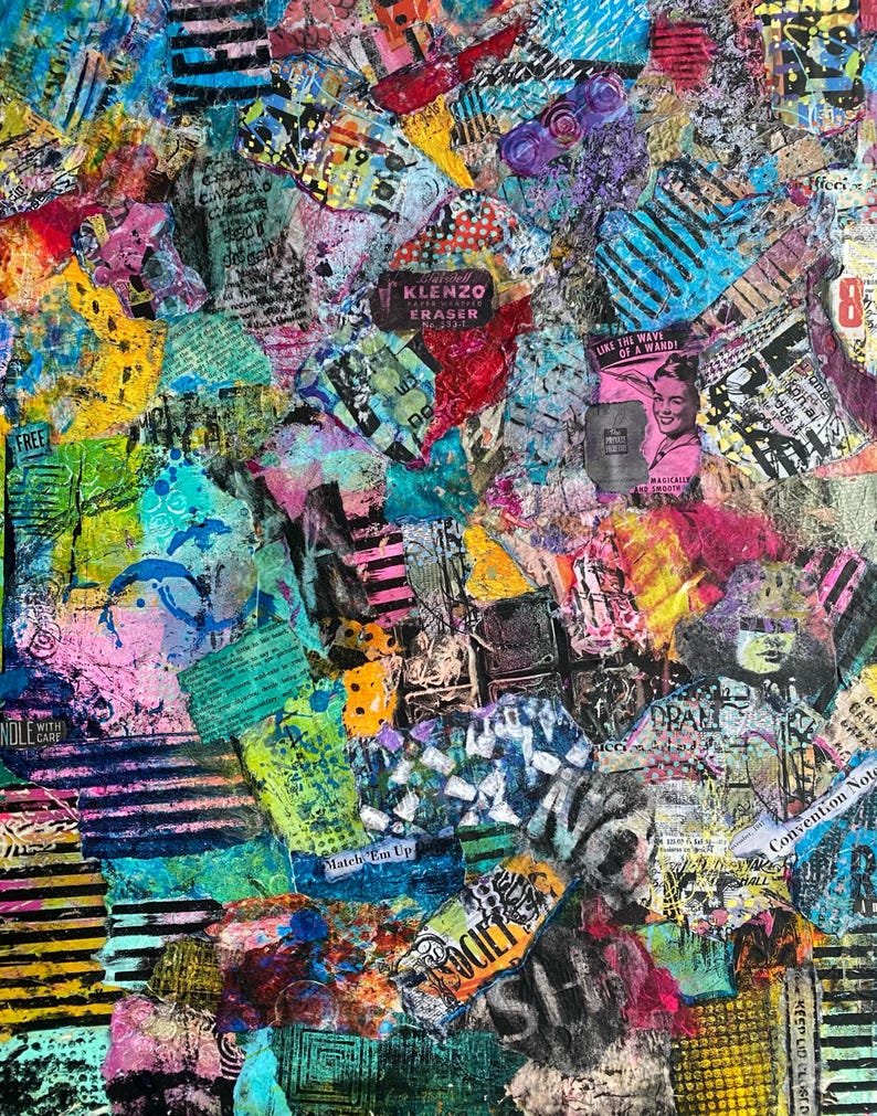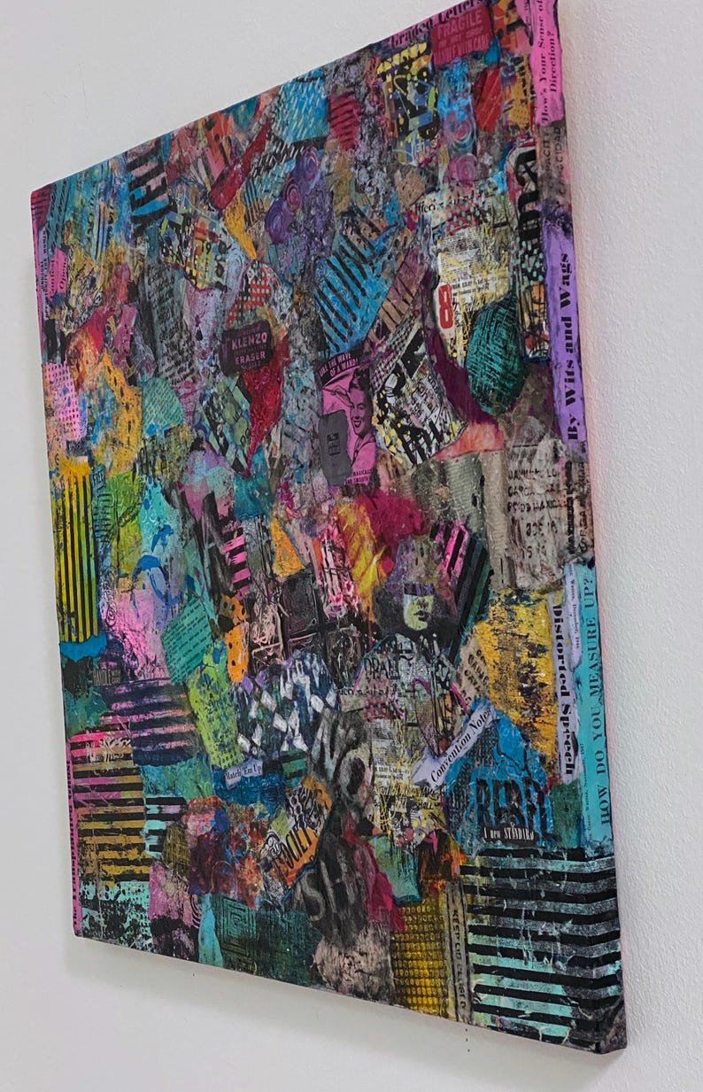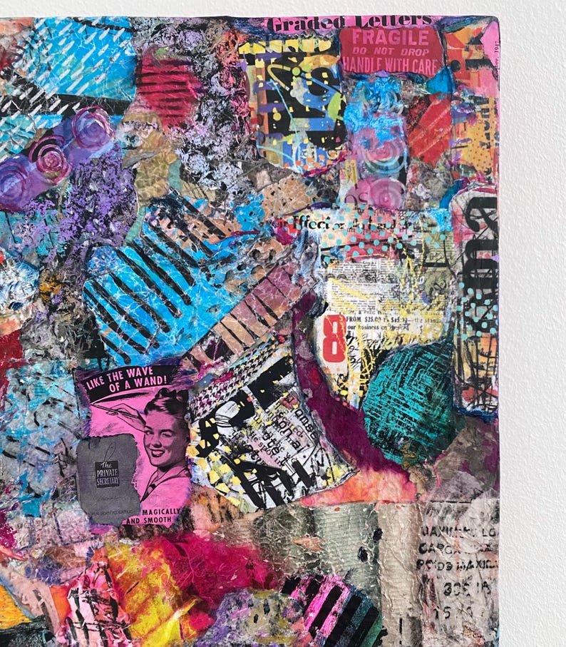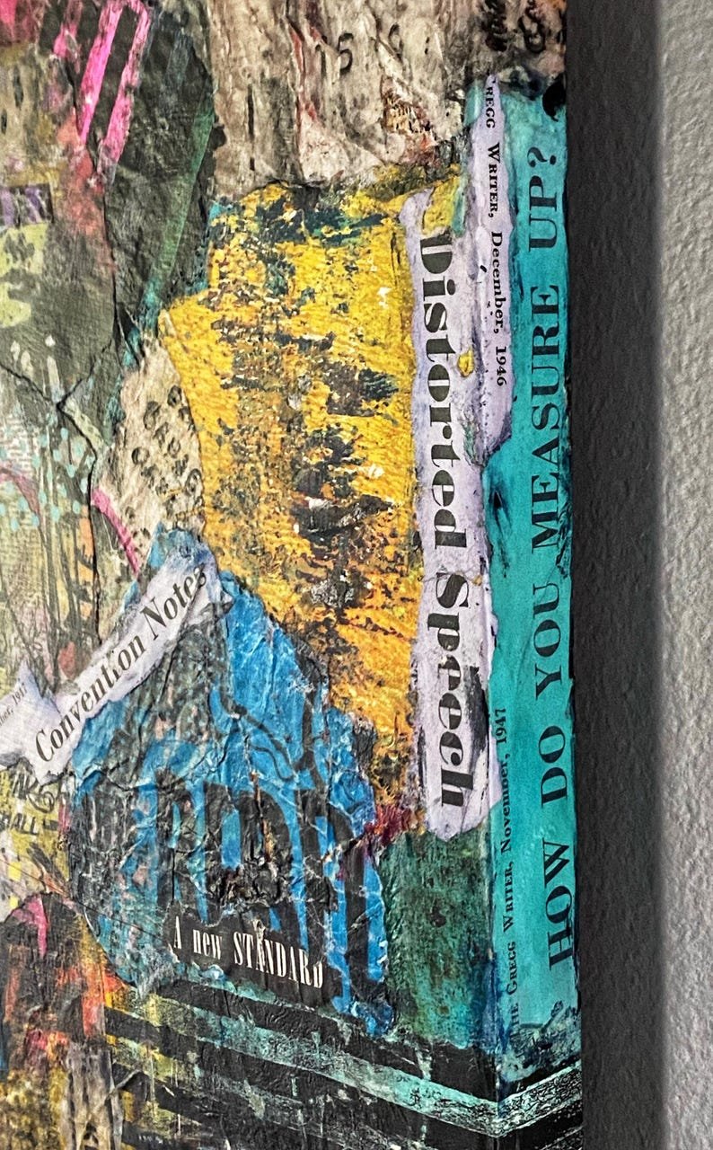 Materials include a combination of deconstructed original abstract paintings, oil pastel transfers of street signs and trash bins onto wax paper, recycled magazine images sanded down to their barest elements, and paper clippings from genuine vintage stenographer periodicals from the 1940’s, as well as torn vintage sheets from classic plays.