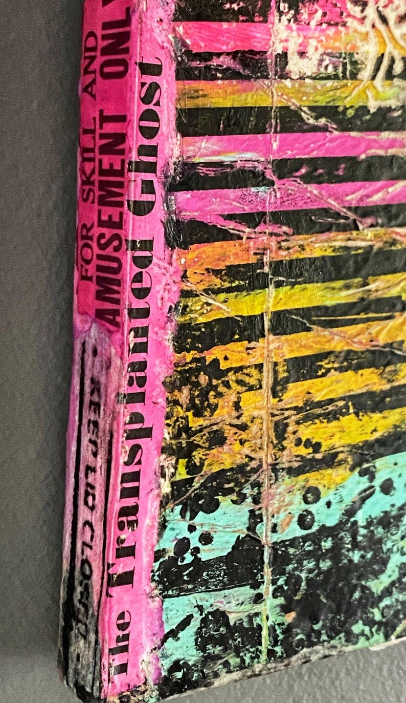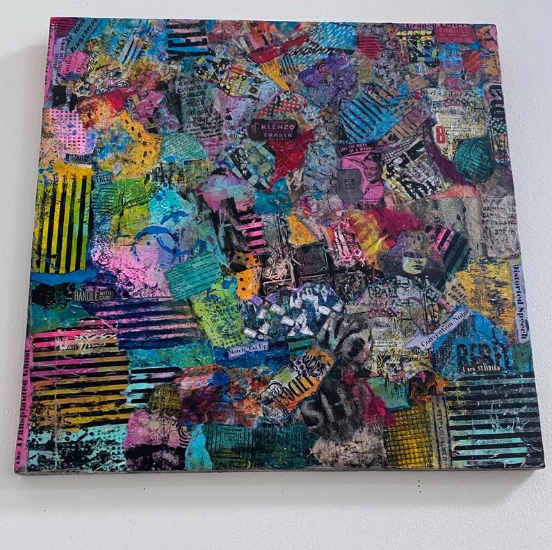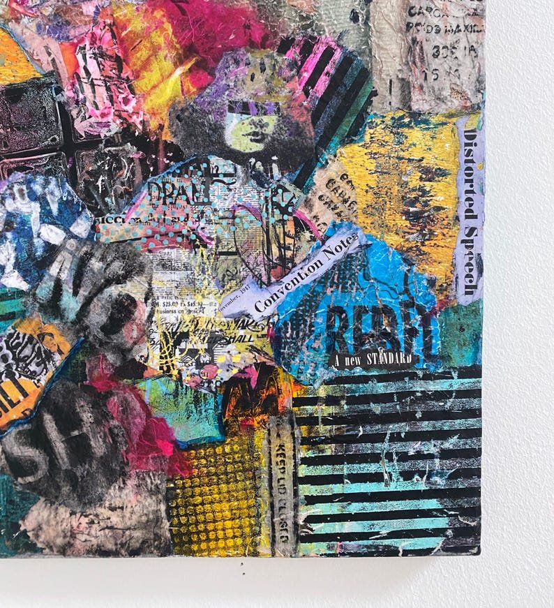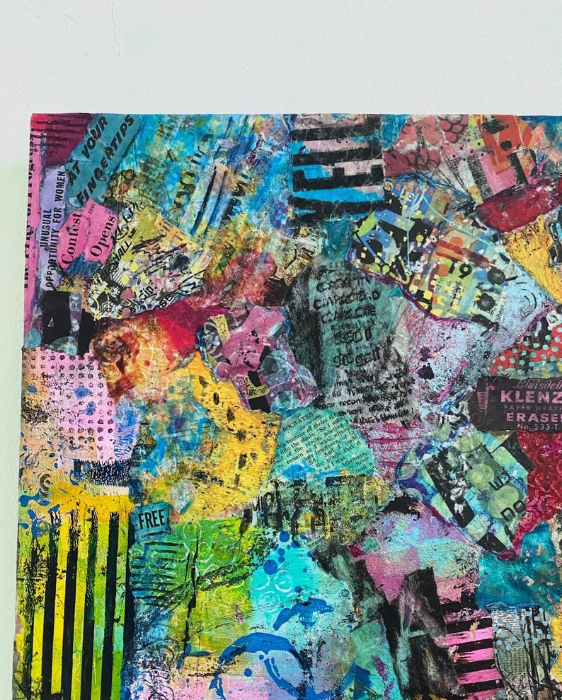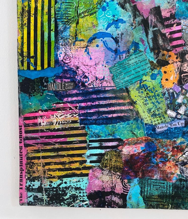 Materials include a combination of deconstructed original abstract paintings, oil pastel transfers of street signs and trash bins onto wax paper, recycled magazine images sanded down to their barest elements, and paper clippings from genuine vintage stenographer periodicals from the 1940’s, as well as torn vintage sheets from classic plays.