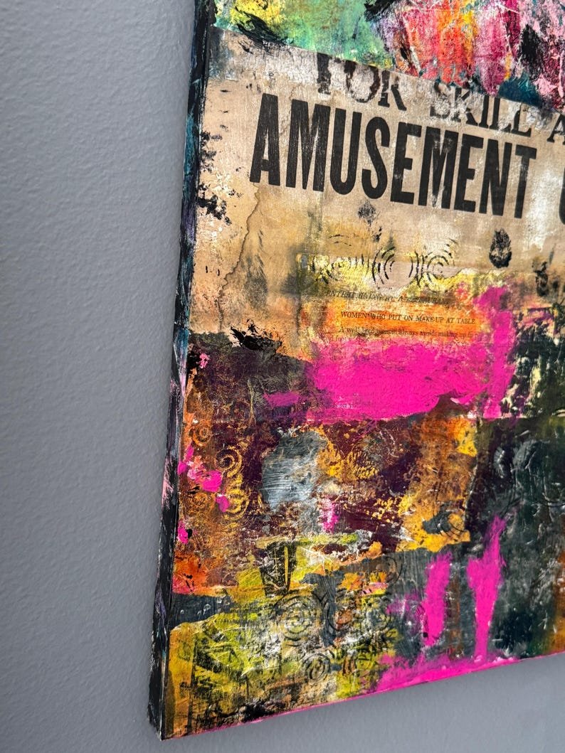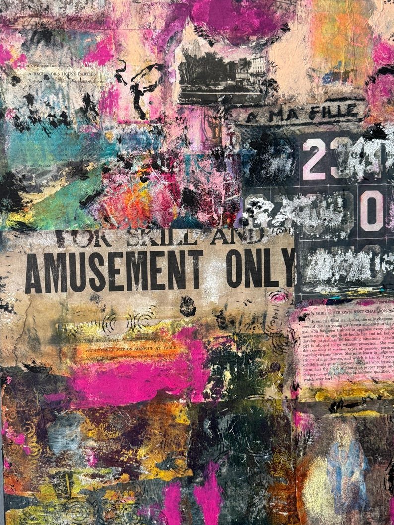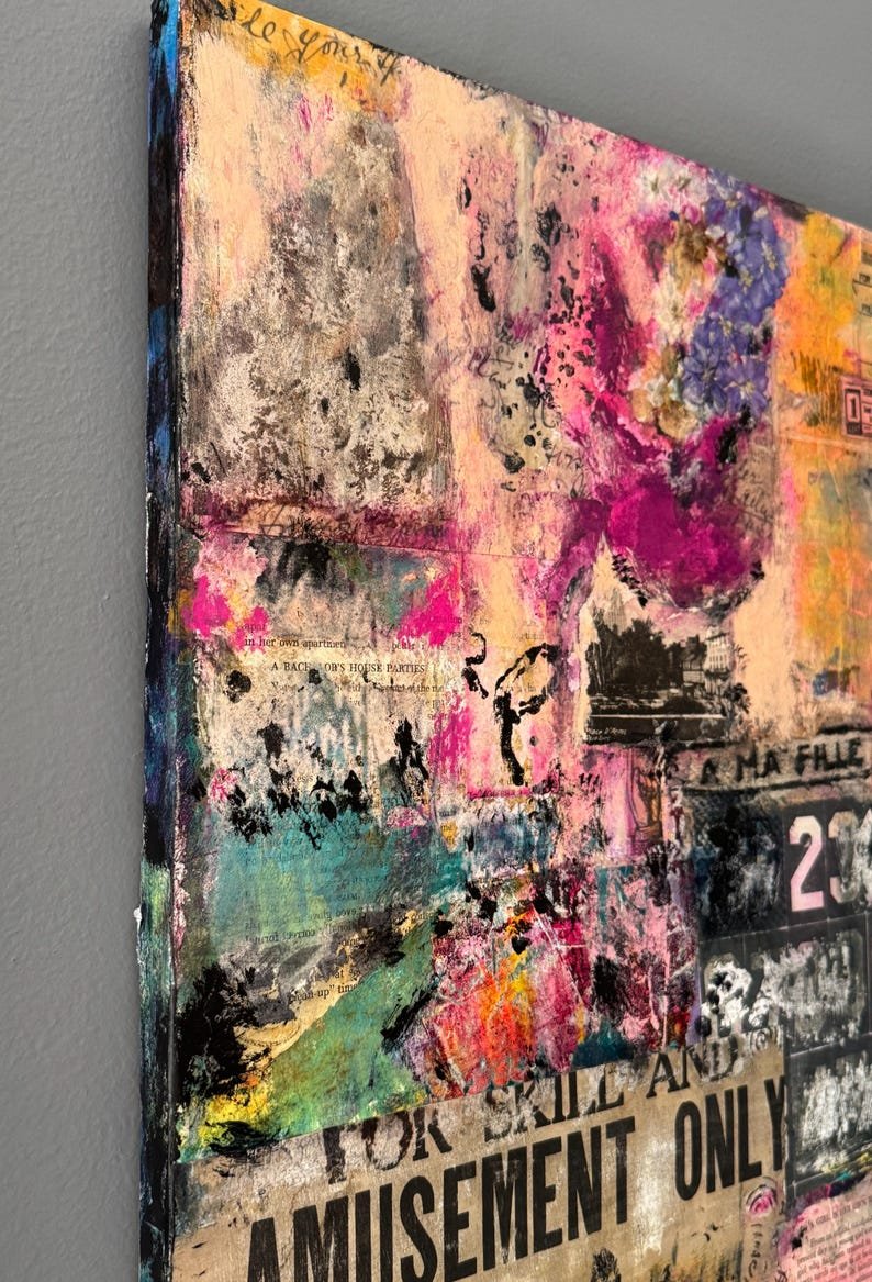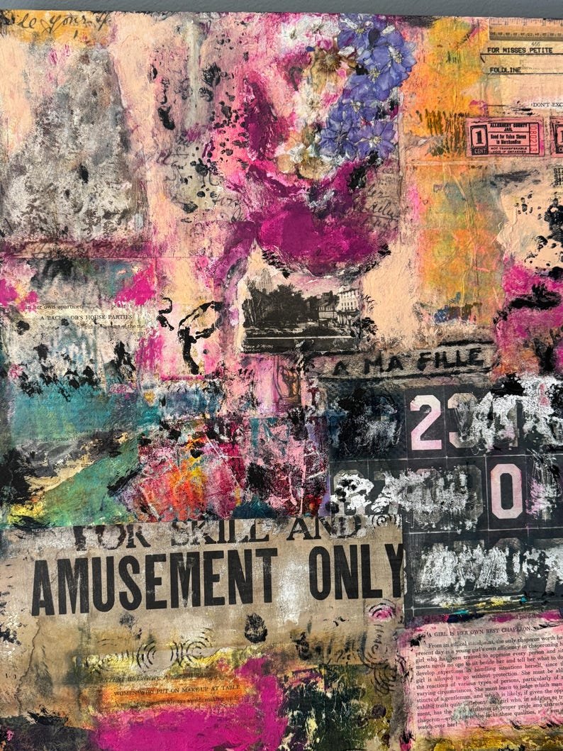 Materials include a combination of deconstructed original abstract paintings and photographs, recycled magazine images sanded down to their barest elements, acrylic paint and inks, vintage papers ranging from jailhouse commissary tickets to dressmaking pattern paper, as well as passages from a vintage publication of Emily Post’s “Etiquette.”