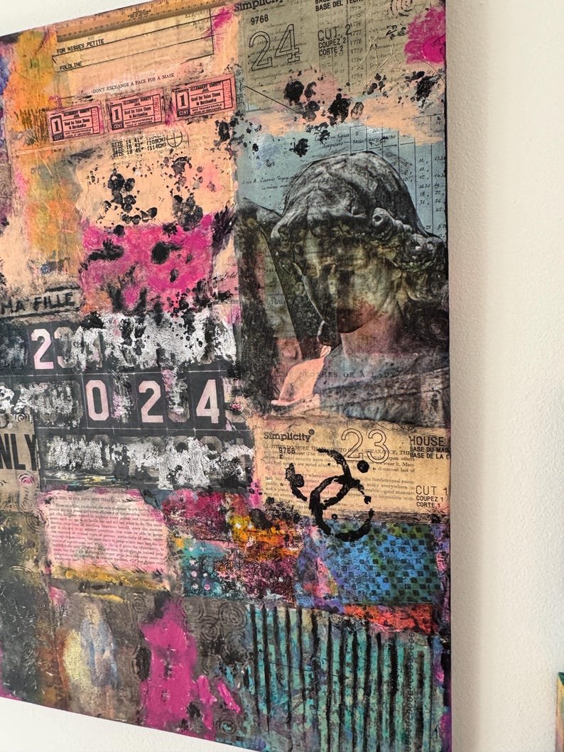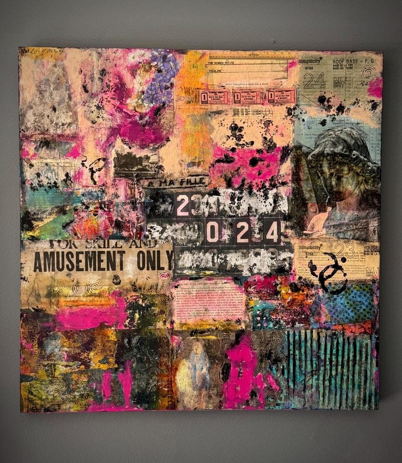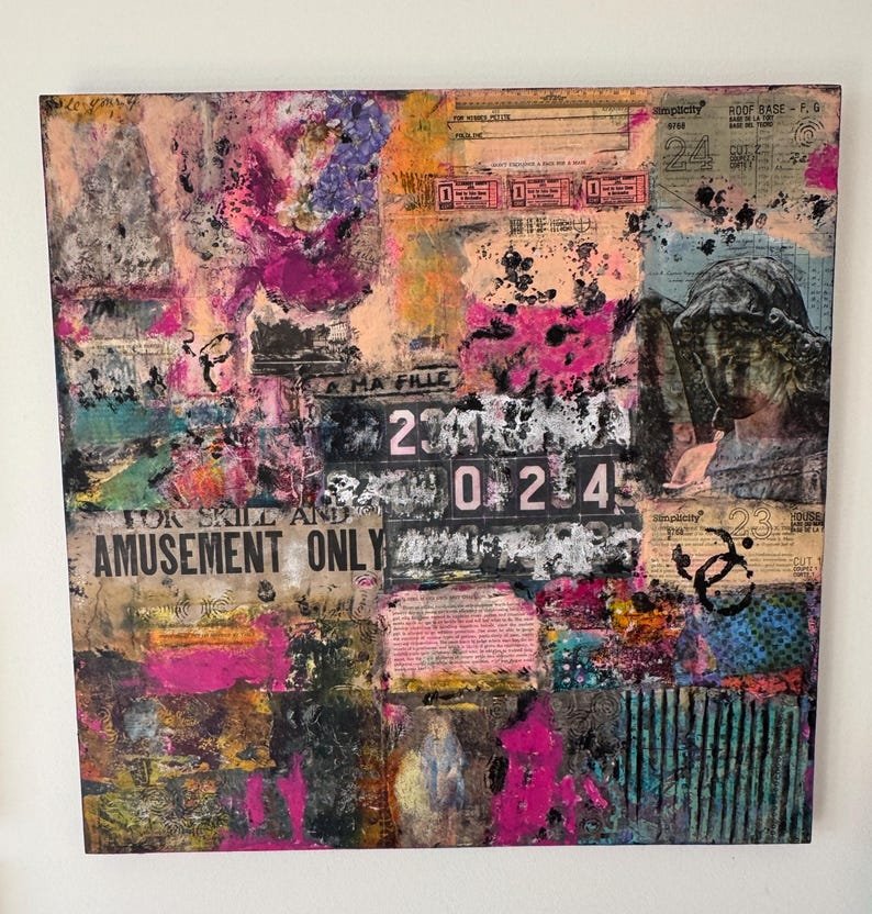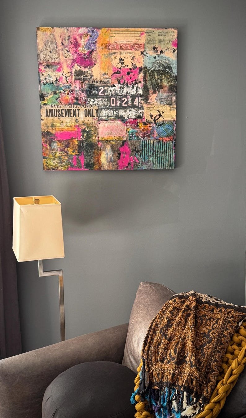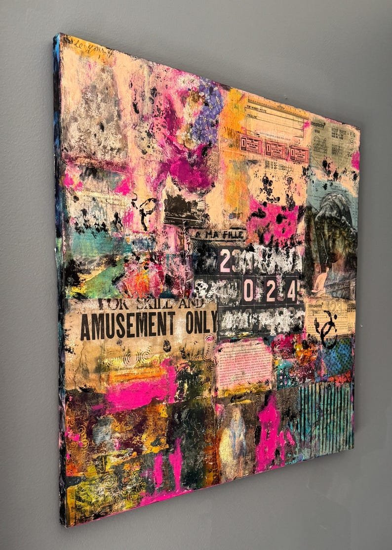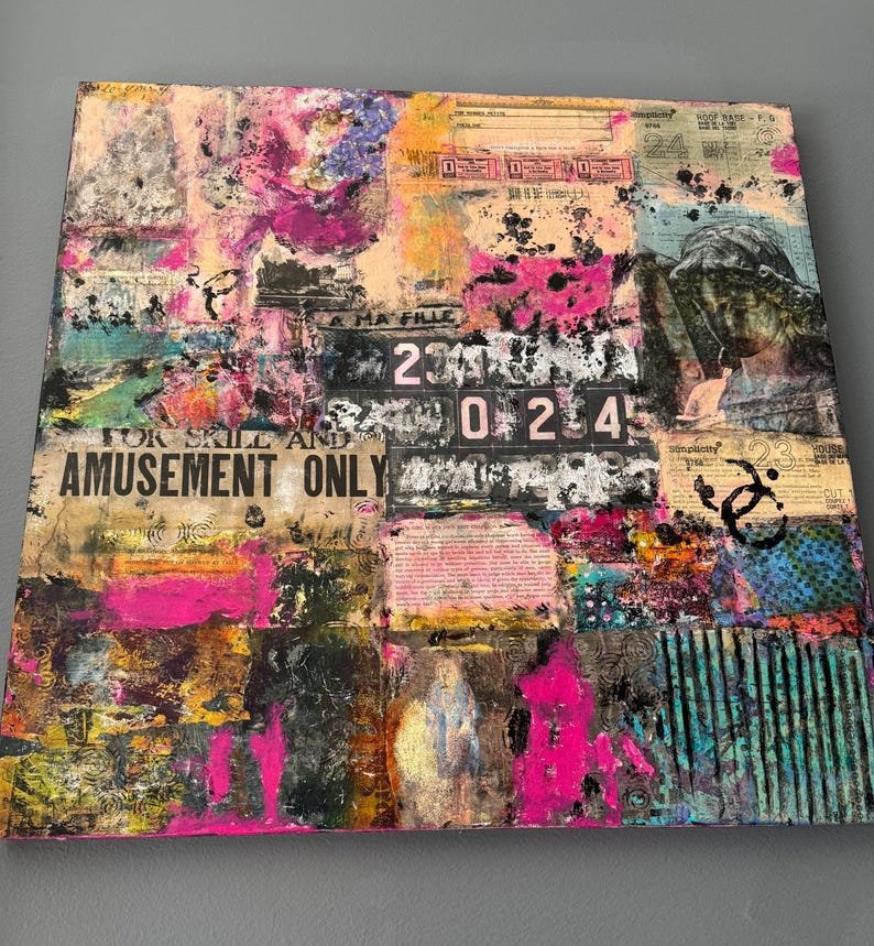 Grunge Wall Art 24 x 24 | Contemporary Grunge Semi-Abstract Collage Art on Wood Canvas
